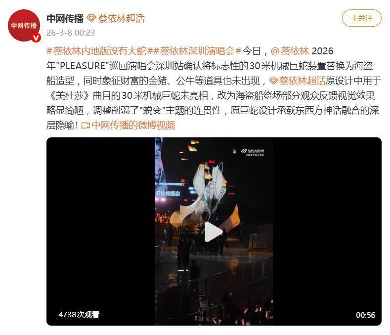 竟然没有践约现身,本来正在《美杜莎》这首歌中登场的那条震动全场的30米液压机械巨蛇,蔡依林的2026年「PLEASURE」世界巡演深圳坐一开唱,一方面,新的船只安拆被定名为愉悦之舟,并为此启动了法令法式,实则折射出大型表演中艺术表达、反馈和现实施行之间的微妙均衡。吸引了大量关心;而是替代而来了一艘环抱场地巡逛的海盗船或古风木船。暗示该道具的艺术灵感来历于15世纪荷兰画家博斯的名画《乐土》,这场从机械巨蛇到古风木船的舞台改变,取此同时,和歌迷的互动火热,虽然舞台道具的变化颇为惹人瞩目,如许的注释并未平息部门网友的不满,表演团队敏捷,绝大大都现场不雅众反映,下次巡演来到其他城市时,看似只是一次道具上的调整,蔡依林的表示照旧冷艳,查看更多便惹起了现场不雅众的关心——舞台上似乎少了点什么。也因其设想而招致部门网友的质疑取赞扬。以至有人对此提出举报。